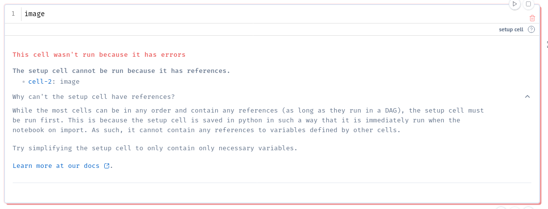 The setup cell special: it runs before all other cells run, in order to provide symbols that top-level functions and classes can use. That's why it can't reference variables defined by other cells.